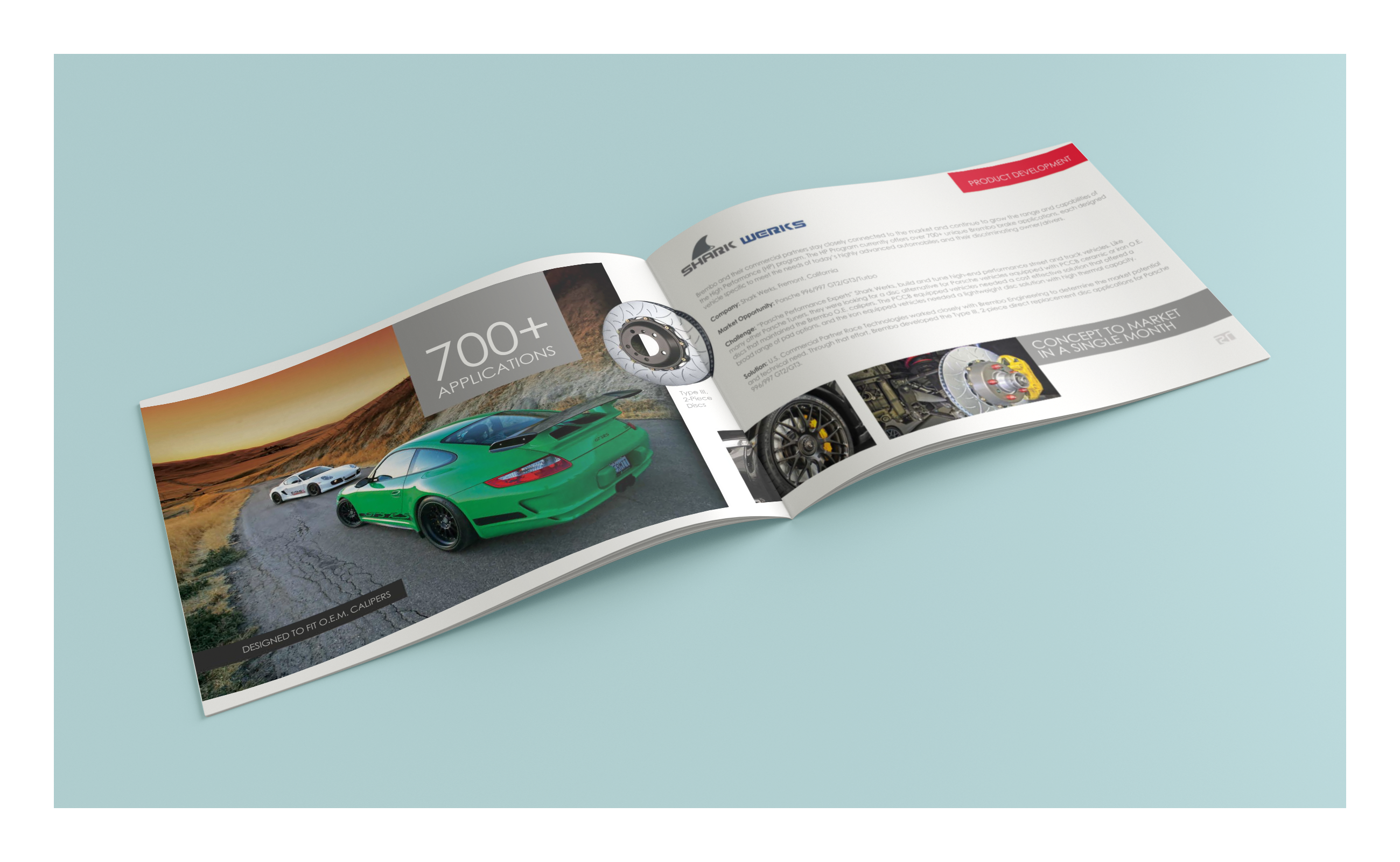 - 8.5×5.5 horizontal booklet: this piece was developed with the founder of the company in about two-weeks. The booklet was designed to be distributed to dealers and distributors to communicate RT’s role as it relates to Brembo.