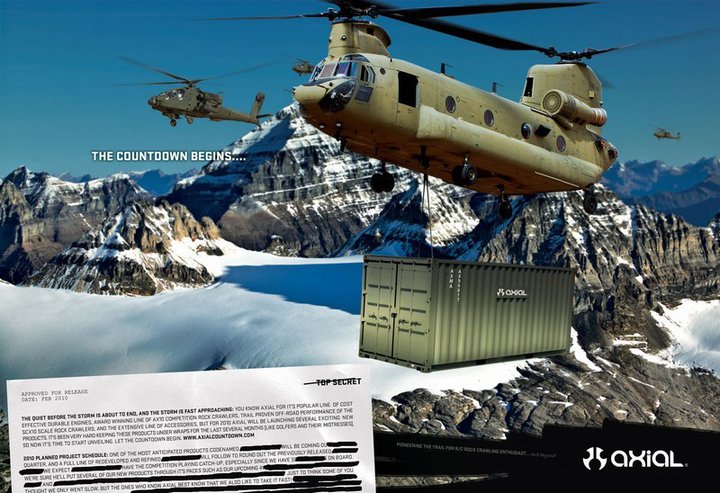 - Advertisement (left): the marketing objective was to establish Axial as the leader of R/C rock crawlers. The print ad was run every other month for six-months to stake Axial’s claim as the first to come out with a rock crawler because several competing companies were following suit with their own rock crawler.